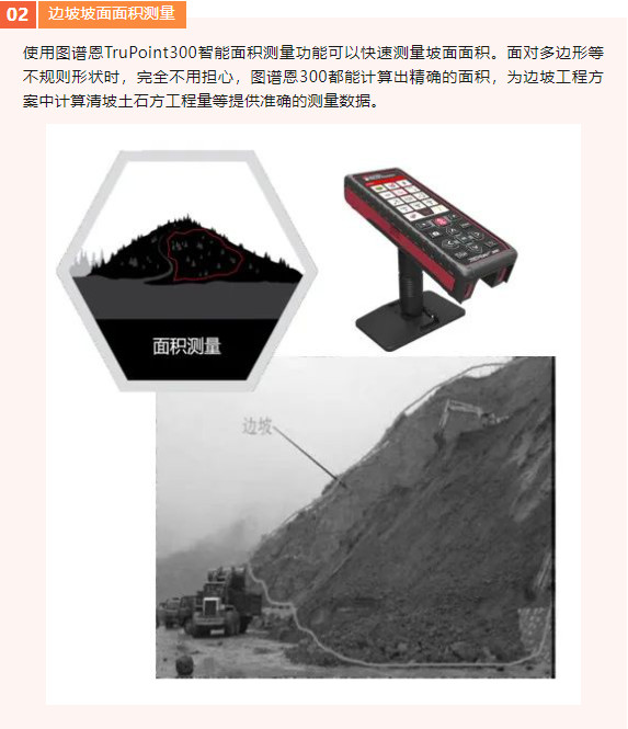 边坡工程中,对自然边坡和人工边坡进行改造时,需要对坡长、坡高、坡面面积等进行测量,从而为工程方案提供数据支持。